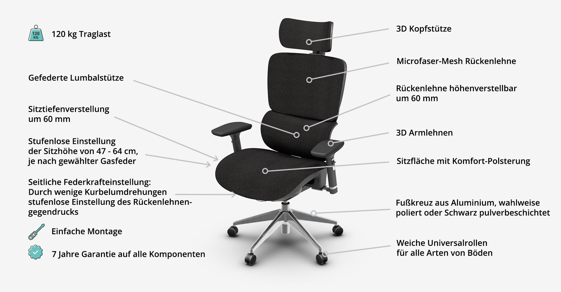 Die gefederte Lordosenstütze unterstützt mit optimalem Druck die Lendenwirbelsäule und die natürliche S – Form der Wirbelsäule stabilisiert. Damit wird eine aufrechte Haltung gefördert und einer ungesunden Rundrückenhaltung aktiv entgegengewirkt.