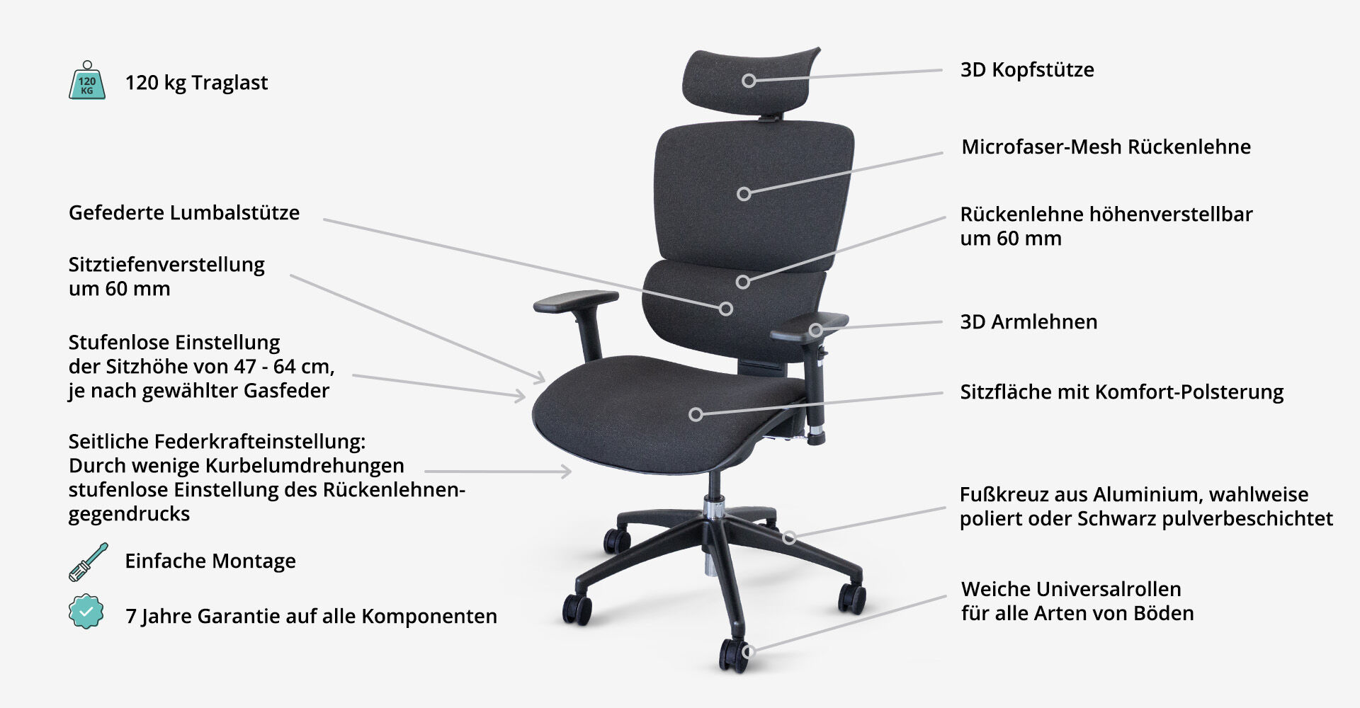 - Hochwertiges 70 cm Fußkreuz aus Aluminium für einen sicheren Stand