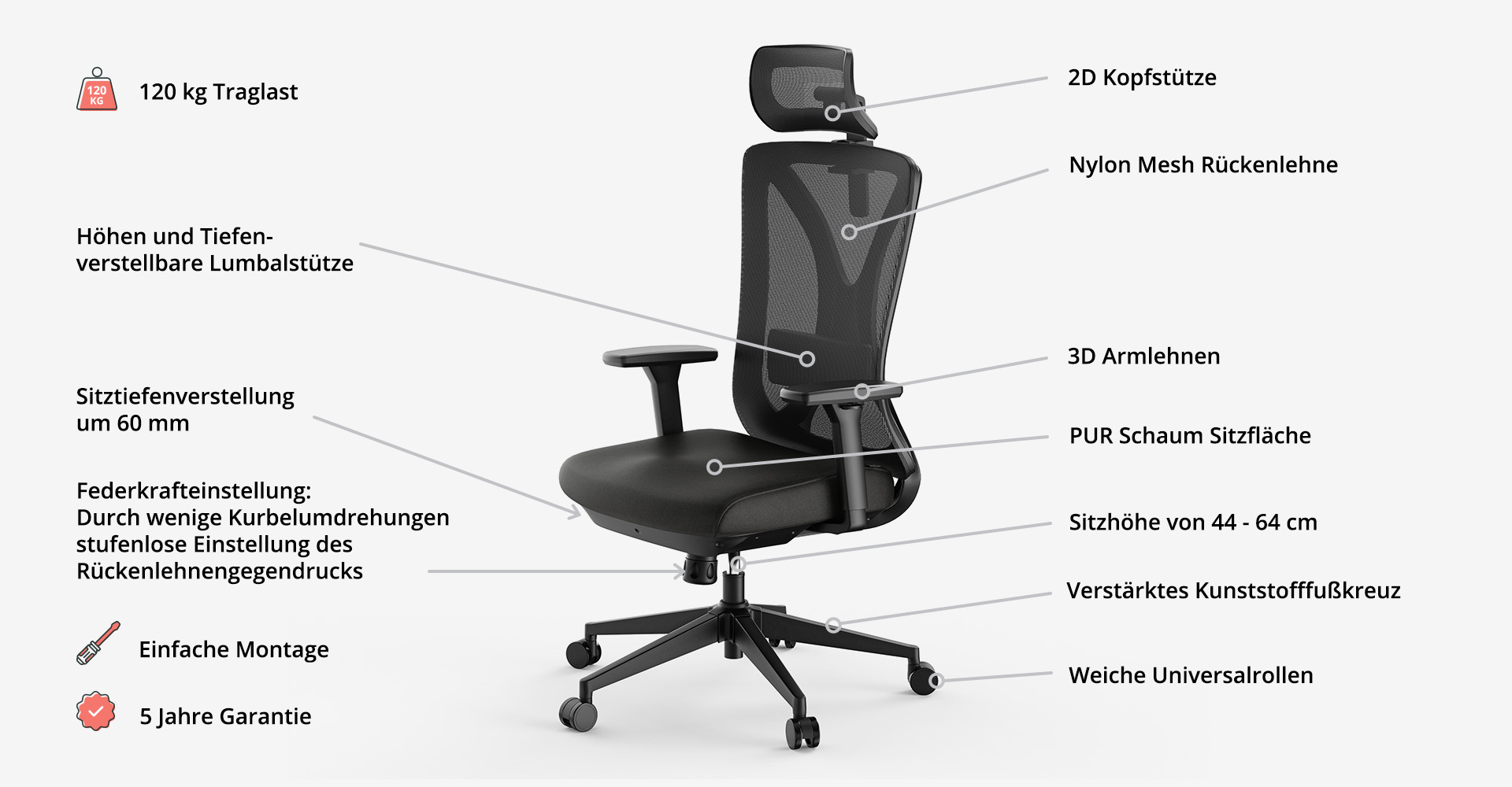 Durch die höhenverstellbare Lordosenstütze wird die Lendenwirbelsäule sowie die natürliche S – Form der Wirbelsäule ideal unterstützt. Dieses wichtige ergonomische Feature wirkt einem Rundrücken aktiv entgegen.