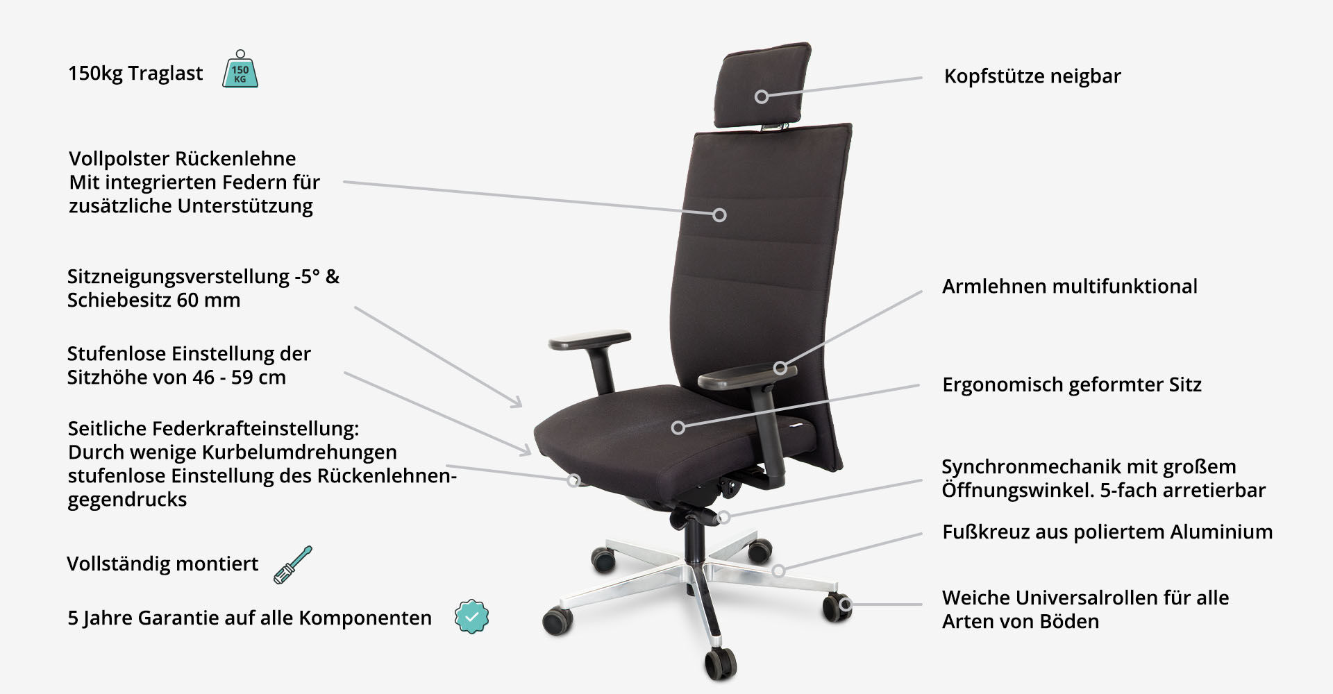 Ergonomischer Bürodrehstuhl für große und schwere Menschen bis 150 Kilo. Mit verstärkter Rückenlehne, Aluminiumkreuz und erweitertem Verstellbereich.